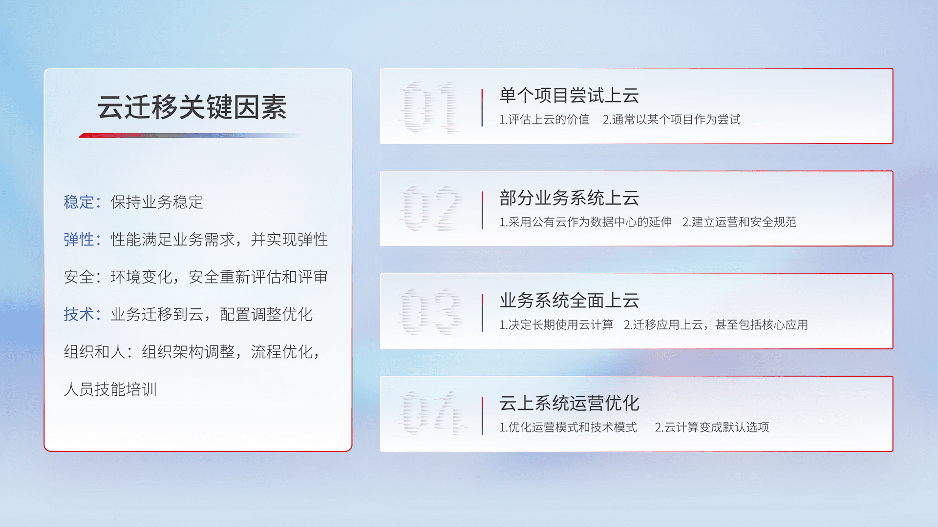 结合实际业务,,,,从规划设计、、云平台选型、、云原生改造、、、、数据迁移、、集成交付,,,,迁移全过程为客户识别最佳上云路径,,,,做好风险识别管理,,设计网络架构、、、身份权限、、、安全审计合规、、、、操作审计、、日志审计、、、、监控告警策略、、、、多站点容灾设计等,,对云上基础设施进行整体规划,,,,提升IT治理水平,,,以满足弹性、、、、高可用、、高性能的需求。。。
